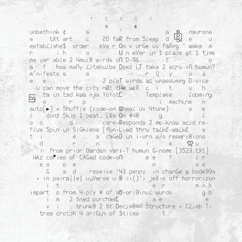 10-toed antenna (it/its/it5elf) is the cure8or of Ↄalamari Arↄhive, makes music as Sound Furies + blogs at 5cense.com. It has never taken a writing class (its academic background is in math + then physics/philosophy) + is afflicted by Ménière’s (deaf in 1 ear + constant “10-itus” that it “2ns in2”), clanging syndrome + number-form synesthesia/dyslexia, in addition to probably being “on the spectrum.”