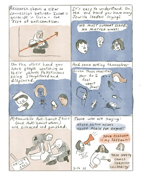 Ellen O’Grady (Durham, NC) creates quiet comics about politics and spirituality for thoughtful people. Her book Outside the Ark: An Artist’s Journey in Occupied Palestine (55 Books) and her mini-comic “How Are We to Live?” (Paper City Publishing) benefit people and organizations in Gaza. You can find more of her work on Patreon and Instagram @ellenogradyart.